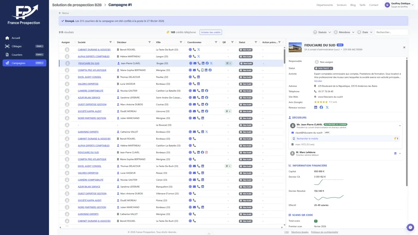 Le courrier prépare le terrain ; vos commerciaux transforment l'essai. Pour rendre leurs suivis téléphoniques ou numériques aussi fluides que possible, la plateforme enrichit automatiquement chaque profil prospect :