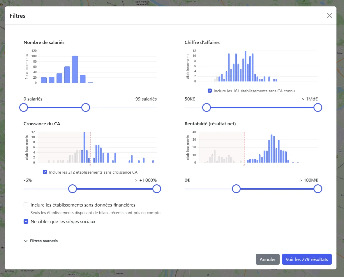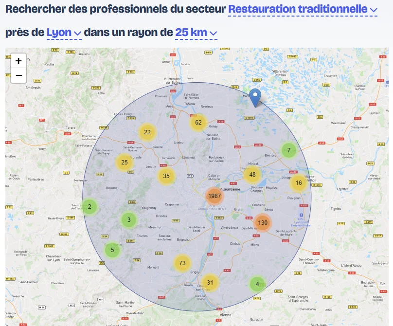 Développez votre ancrage local en ciblant par département, par ville, ou en définissant un rayon kilométrique précis autour d'un point donné. C'est un atout majeur pour les équipes commerciales terrain.