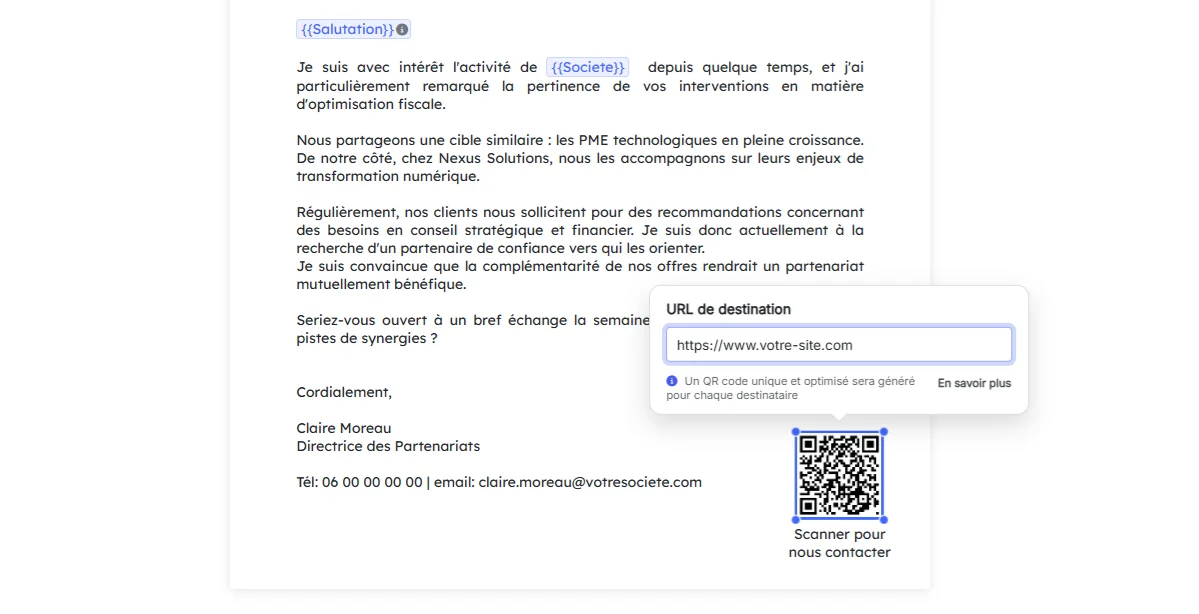 Chaque courrier imprimé génère un QR code unique attribué à son destinataire. Lorsque le décideur scanne ce code pour consulter votre proposition, votre site web ou une vidéo de démonstration, l'action est immédiatement enregistrée. Vous pouvez ainsi aisément faire pointer un QR code vers votre page de destination et suivre les ouvertures depuis votre Dashboard.